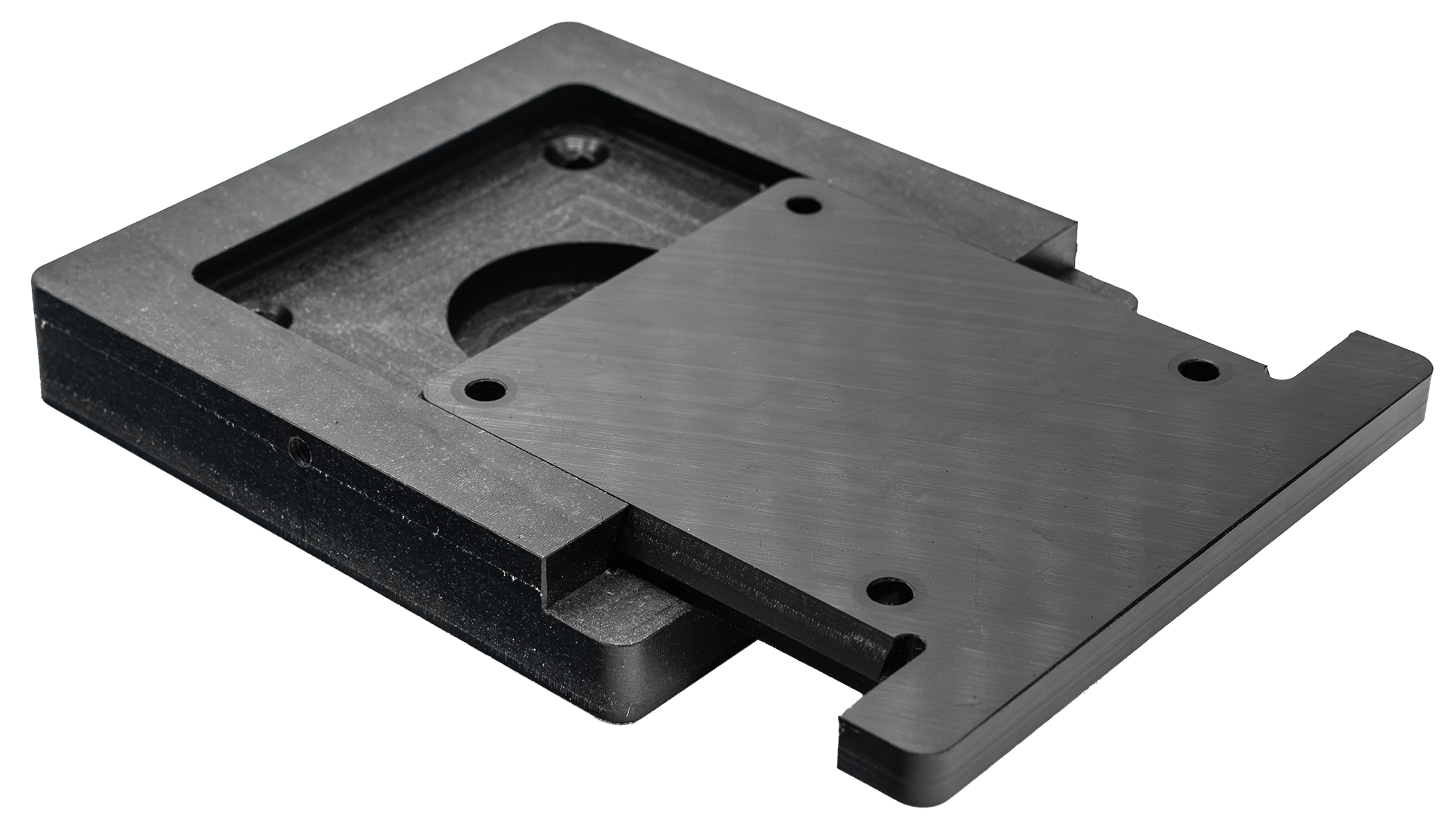 Dan is het nu tijd om beide delen eenvoudig in elkaar te schuiven. Zorg ervoor dat beide delen schoon zijn, zodat ze goed op elkaar aansluiten. Schuif de bovenplaat op de voetplaat in een horizontale beweging om ervoor te zorgen dat het koppelstuk een perfecte en onzichtbare verbinding vormt.